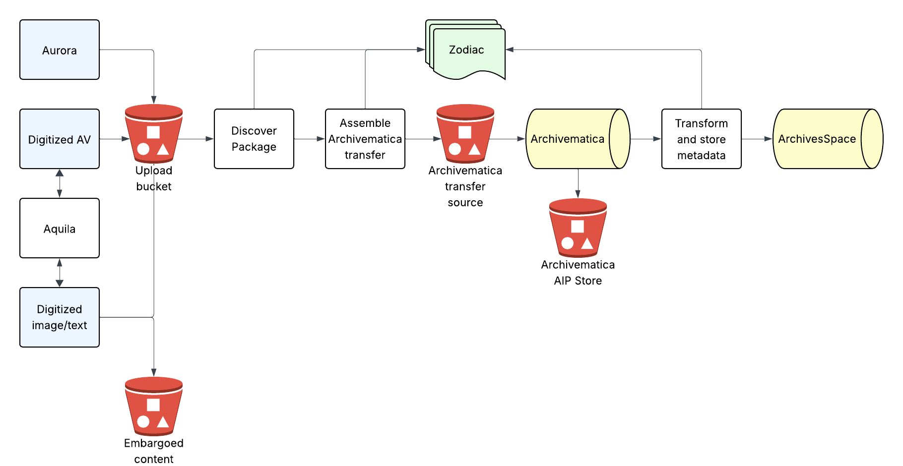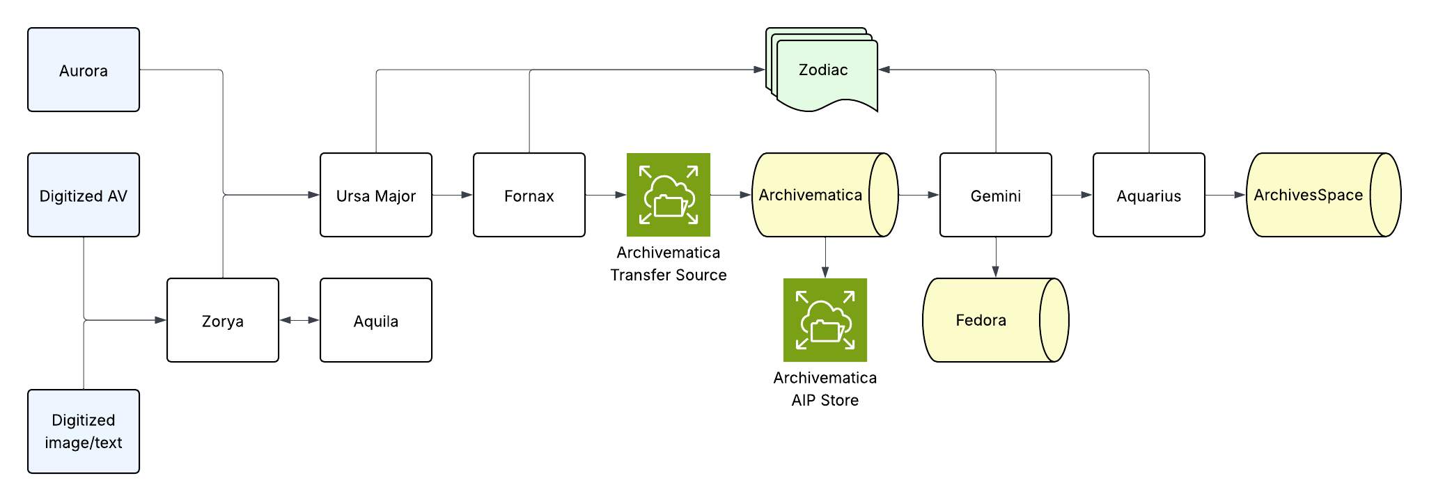 We built the original version of this pipeline back in 2019 as part of Project Electron, an initiative to build sustainable, user-centered and standards-compliant infrastructure to support the ongoing acquisition, management and preservation of digital records. As we conceived of it then, the pipeline integrated Aurora (our home-grown appraisal and accessioning application) with Archivematica and ArchivesSpace, automating the ingest of born-digital records from donor organizations. Over time, we started to use this same pipeline for digitized content as well, adding additional services and intake pipelines for digitized audiovisual and image and text materials.